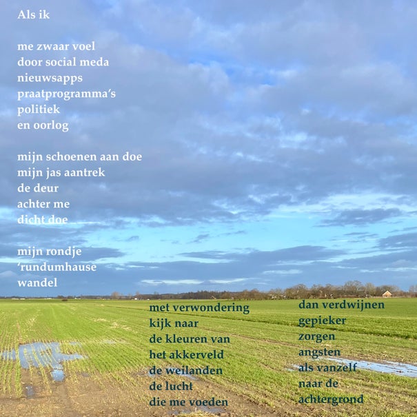 Het gaat me gemakkelijker af als ik naar buiten loop, gewoon een rondje om en elke dag opnieuw verwonderd raad over het uitzicht en de kleuren. Daar kun je afschakelen en de wereld-carrousel even op de achtergrond plaatsen.